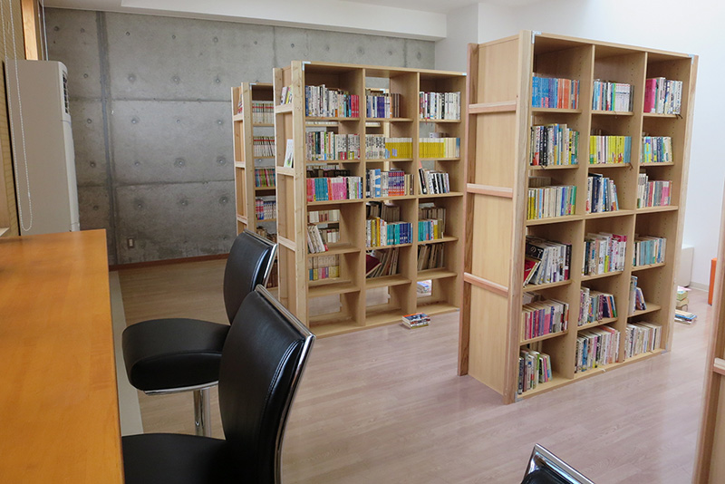 約2000冊の文庫本や漫画や詩集等が閲覧できます。席は8席+テーブル席3席ございます。運動の合間にぜひ一度お越しください。